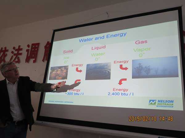 霜冻是一种气象灾害,其造成的损失不可估量。凯利先生在果园喷水抗霜冻方面的研究比较深入,他重点介绍了喷水抗霜冻原理及方法并参观了宝鸡华圣果业公司的苗圃基地和在建的种植基地。