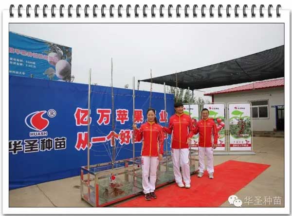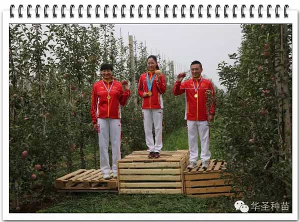 2016年10月11日,宝鸡华圣基地迎来了历届奥运冠军得主,竞走奥运冠军王丽萍,跳水奥运冠军肖海亮和女排主攻手奥运冠军杨昊,这三位奥运冠军来到崔家头种植基地,看到不同于传统苹果园的场景,他们都很惊奇,原来苹果还可以这么种植,就像我们的奥林匹克运动,都是在不断创新和摸索中寻求突破。我们的工作人员也是煞费苦心,为了迎接他们的到来,在园区苹果树行之间用检疫木架框搭起了领奖台,也是展现我们华圣苹果苗木质量的一种形式。奥运冠军们看到这么诱人的苹果,也要拍照留念,不仅为自己代言,也为我们的苹果质量代言。